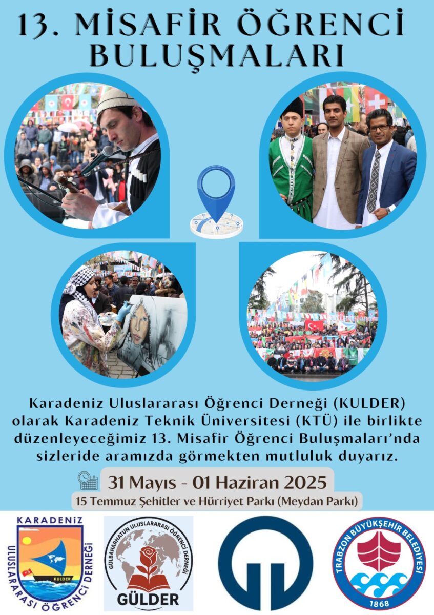Karadeniz Uluslararası Öğrenci Derneği (KULDER) olarak her yıl düzenlenen ve geleneksel hale gelen Uluslararası Misafir Öğrenci Buluşmalarının 13’iüncüsünü bu yıl Karadeniz Teknik Üniversitesi (KTÜ) ve Gülbaharhatun Uluslararası Öğrenci Derneği (GÜLDER) ortaklığıyla 31 Mayıs- 01 Haziran tarihlerinde Trabzon 15 Temmuz ve Şehitler Parkında (Meydan Parkında) yapılacaktır. Trabzon Büyükşehir Belediyesinin de destek verdiği buluşma, 66 farklı ülke öğrencilerinin katılımıyla gerçekleşecek. Uluslararası öğrenciler ülkelerini, kültürlerini, yöresel yemeklerini, müziklerini, kıyafetlerini tanıtacaklar. KULDER Yönetimi etkinlikte herkesi misafir öğrencilerle birlikte olmaya, dünyanın farklı renkleri ve dilleriyle buluşmaya davet ediyor.